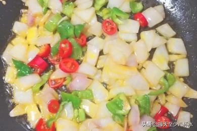 5、锅中倒入适量的菜油,放入洋葱和青椒小米椒,加入一勺盐和一勺醋,翻炒一分钟。