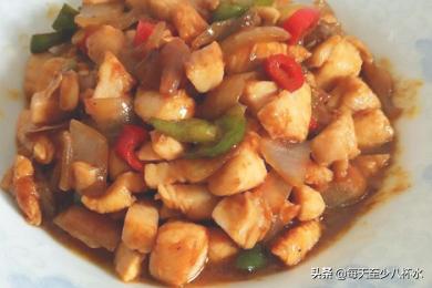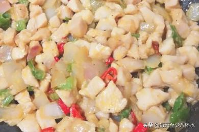 6、倒入腌好的鸡脯肉,大火爆炒,再调入两勺的老抽,翻炒均匀关火。