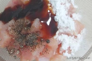 4、加入一勺盐、两勺蚝油、两勺料酒、一勺黑胡椒粉、两勺生粉和三分之一蛋清,抓匀腌渍10分钟入味。