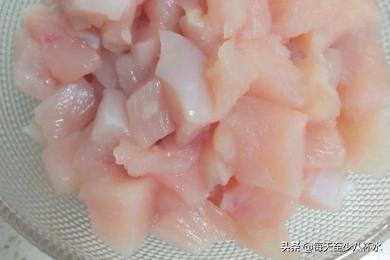 3、鸡脯肉清洗干净,切成直径一厘米左右的小丁。