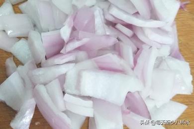 1、洋葱剥去外面的干皮,清洗干净,切成小片,把中间的蒂去皮除掉。