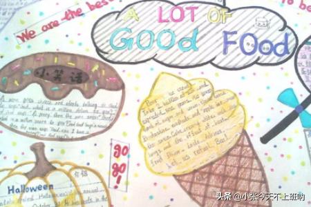 6、最后,在画画的留白里画上美食或者其他图案,可以自己动手画画,也可以请画的好的小伙伴帮忙。这样一份美食手抄报就完成了,是不是没那么难呢?
